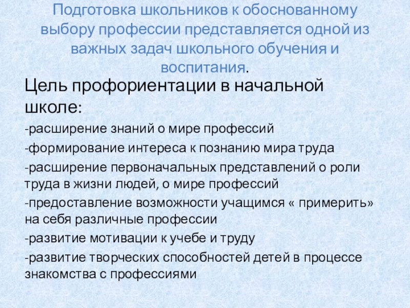 -предоставление возможности учащимся « примерить» на себя различные профессии