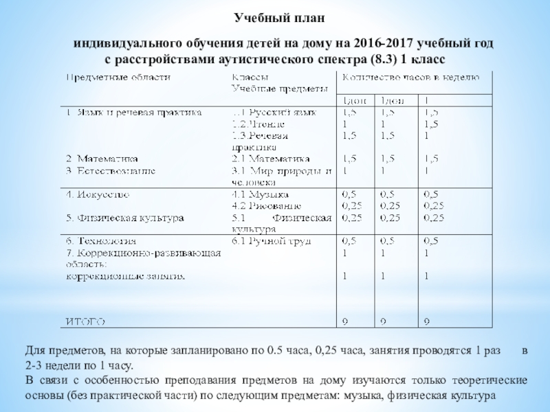 В связи с особенностью преподавания предметов на дому изучаются только теоретические основы (без практической части) по следующим предметам: музыка, физическая культура