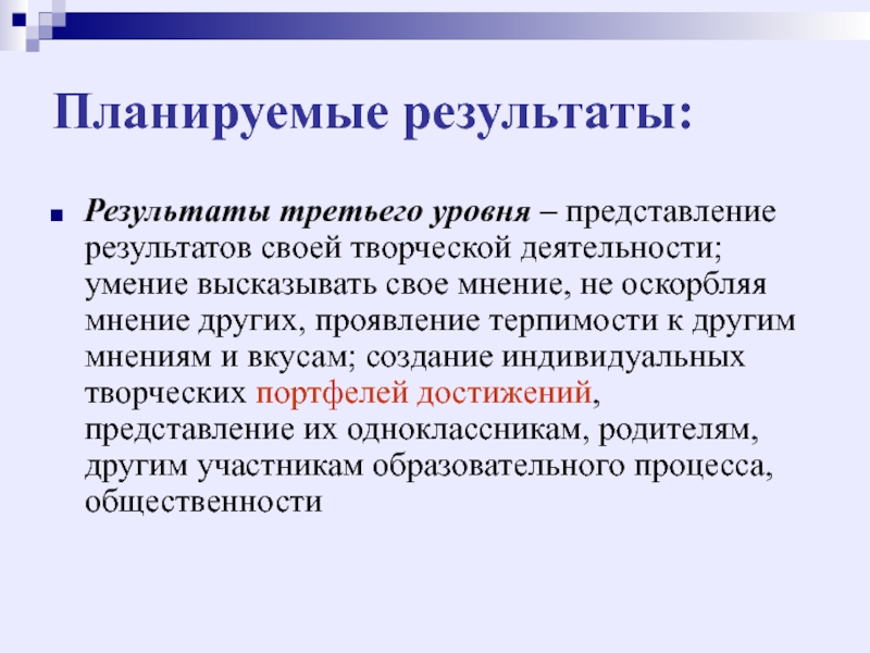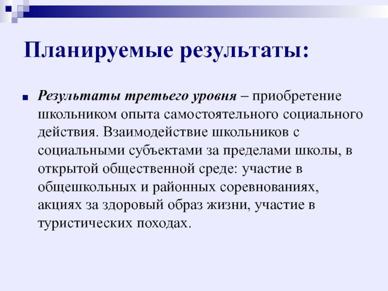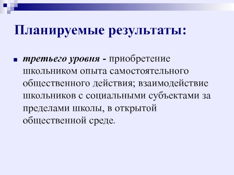 Результаты третьего уровня – приобретение школьником опыта самостоятельного социального действия.