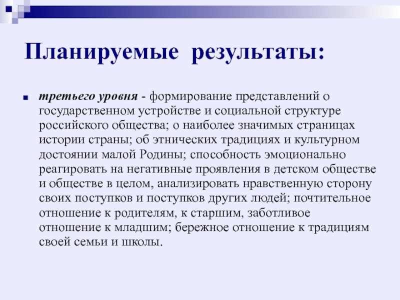 структуре российского общества; о наиболее значимых страницах истории страны; об этнических традициях и культурном достоянии малой Родины; способность эмоционально реагировать на негативные проявления в детском обществе и обществе в целом, анализировать нравственную сторону своих поступков и поступков других людей; почтительное отношение к родителям, к старшим, заботливое отношение к младшим; бережное отношение к традициям своей семьи и школы.