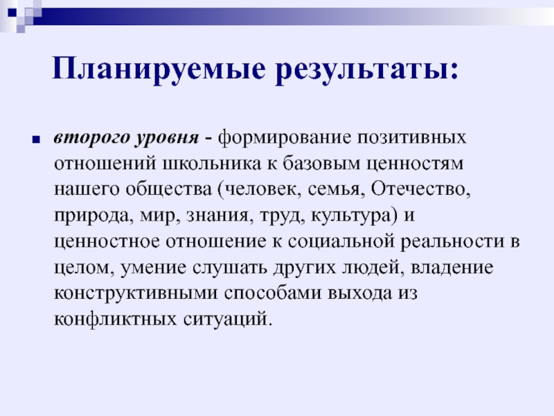 нашего общества (человек, семья, Отечество, природа, мир, знания, труд, культура) и ценностное отношение к социальной реальности в целом, умение слушать других людей, владение конструктивными способами выхода из конфликтных ситуаций.