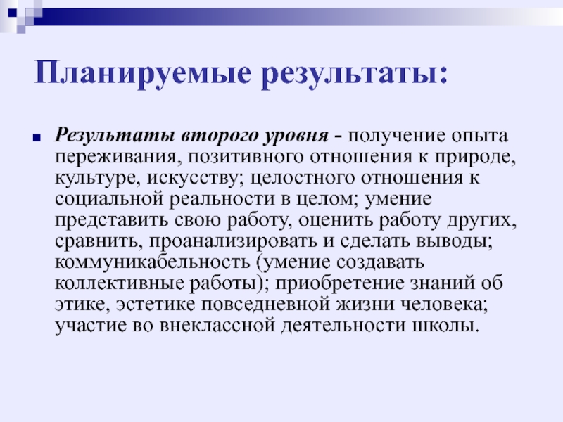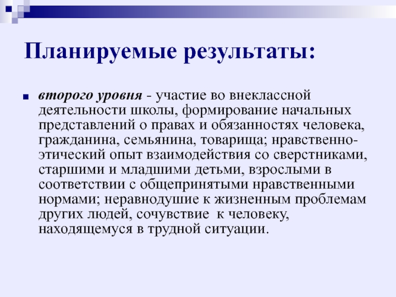 второго уровня - участие во внеклассной деятельности школы, формирование начальных