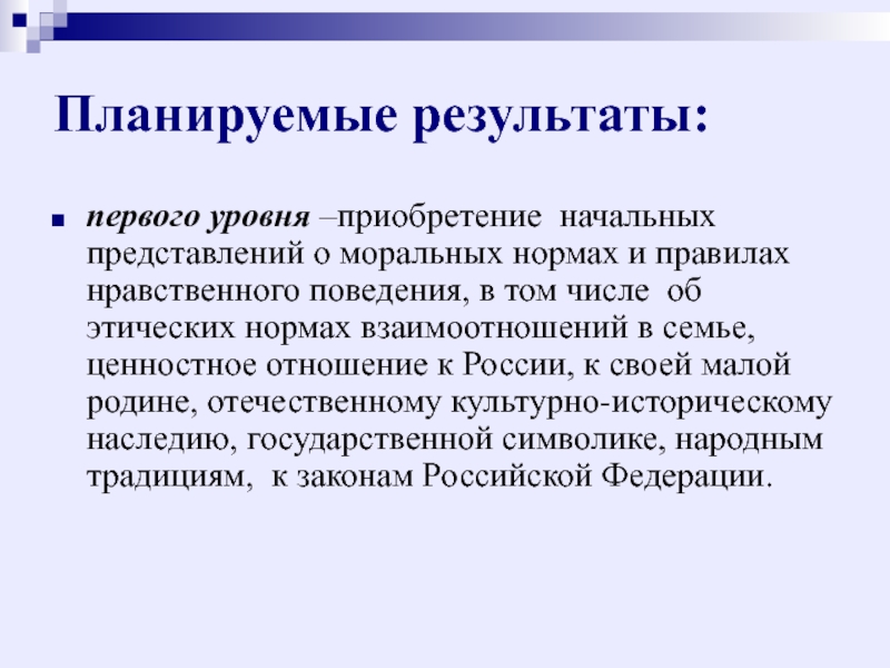 нравственного поведения, в том числе об этических нормах взаимоотношений в семье, ценностное отношение к России, к своей малой родине, отечественному культурно-историческому наследию, государственной символике, народным традициям, к законам Российской Федерации.