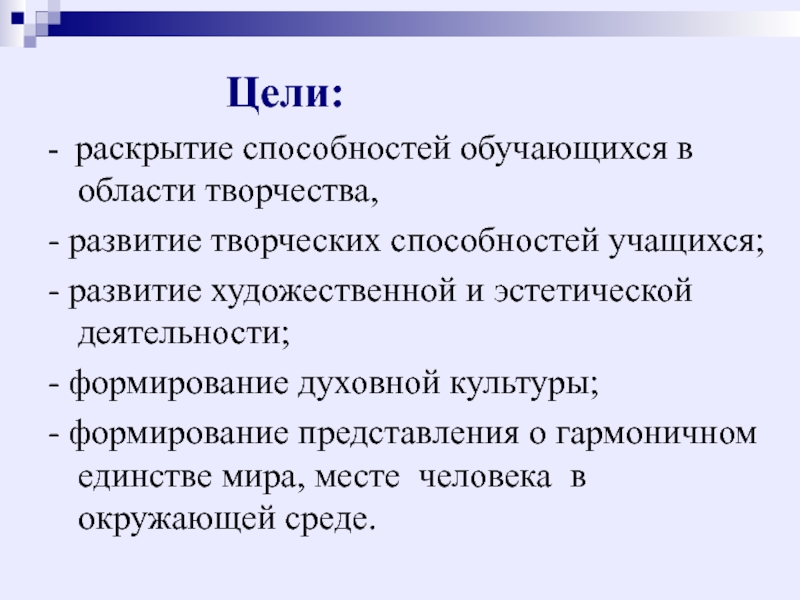 - формирование представления о гармоничном единстве мира, месте человека в окружающей среде.