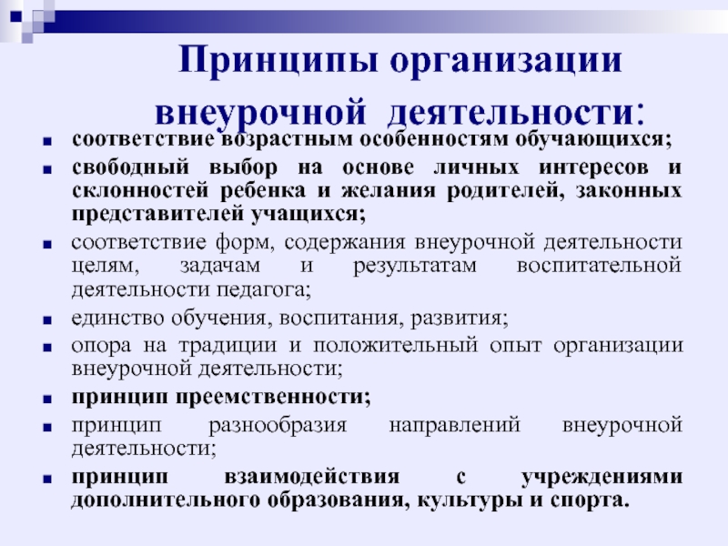 принцип разнообразия направлений внеурочной деятельности;