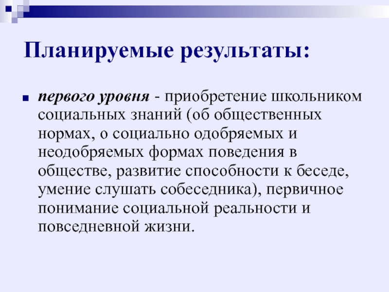 первого уровня - приобретение школьником социальных знаний (об общественных нормах,