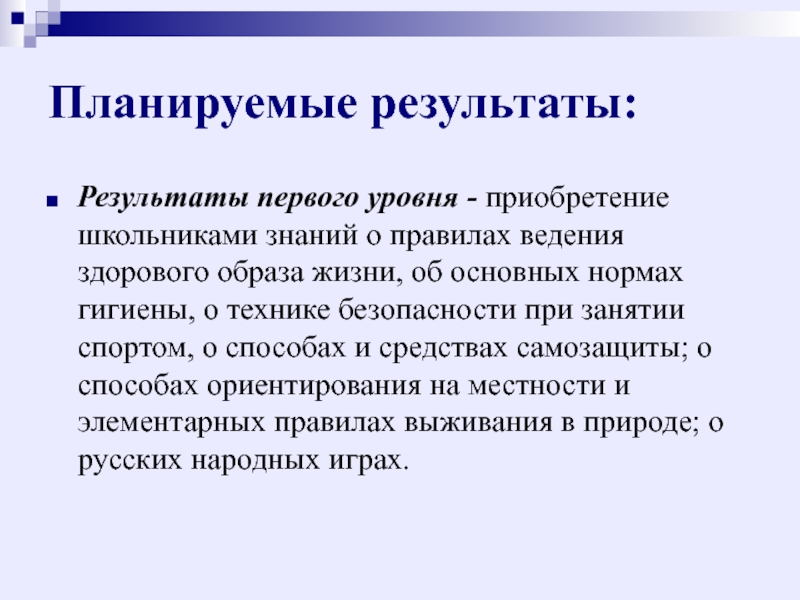 ведения здорового образа жизни, об основных нормах гигиены, о технике безопасности при занятии спортом, о способах и средствах самозащиты; о способах ориентирования на местности и элементарных правилах выживания в природе; о русских народных играх.
