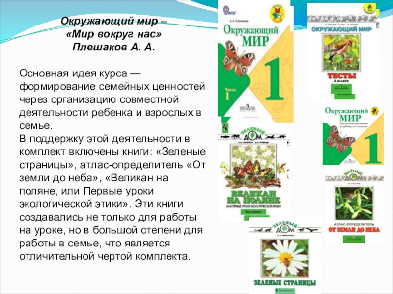 В поддержку этой деятельности в комплект включены книги: «Зеленые страницы», атлас-определитель «От земли до неба», «Великан на поляне, или Первые уроки экологической этики». Эти книги создавались не только для работы на уроке, но в большой степени для работы в семье, что является отличительной чертой комплекта.