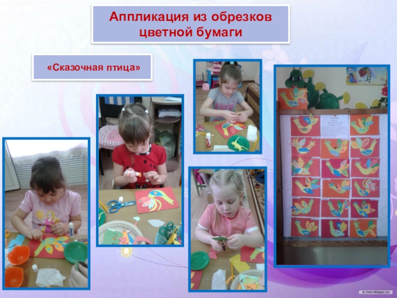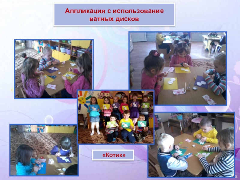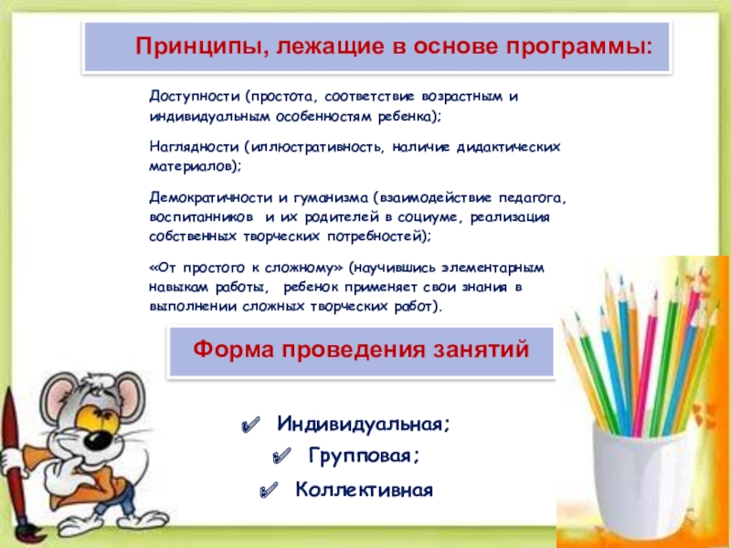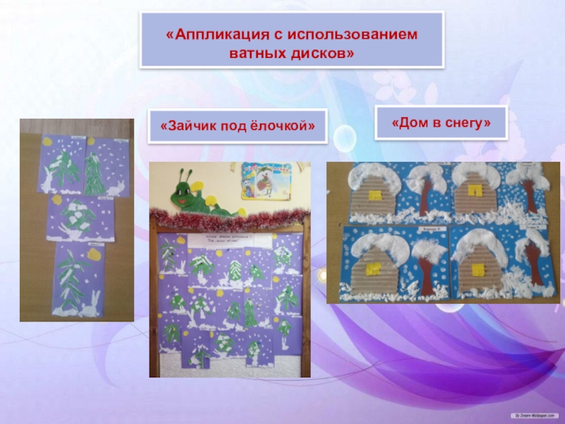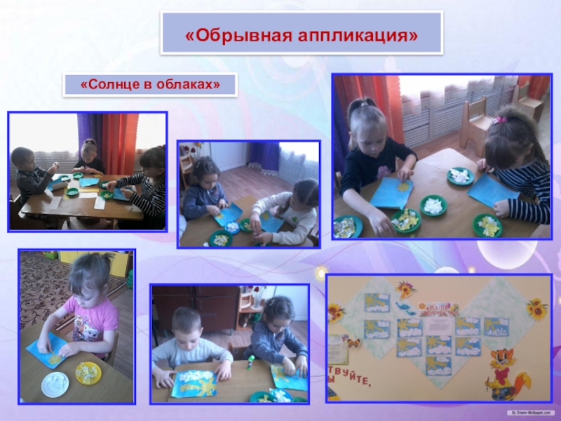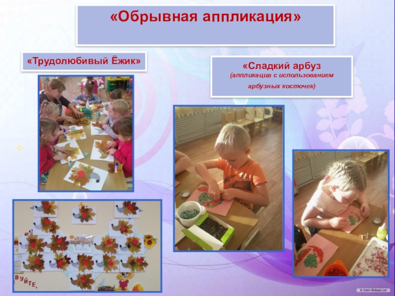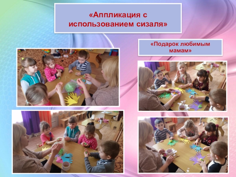 Большое место отводится наглядности, то есть реальному предмету (выполненное взрослым панно, аппликация и т. д.). В процессе занятий наглядность используется в одних случаях для того, чтобы направить усилия ребёнка на выполнение задания, а в других – на предупреждение ошибок. В конце занятия наглядность используется для подкрепления результата, развития образного восприятия предметов, сюжета, замысла.