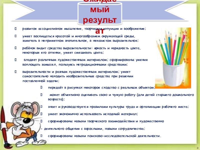 выразительности и разным художественным материалом; умеет самостоятельно находить изобразительные средства при решении поставленной задачи;
