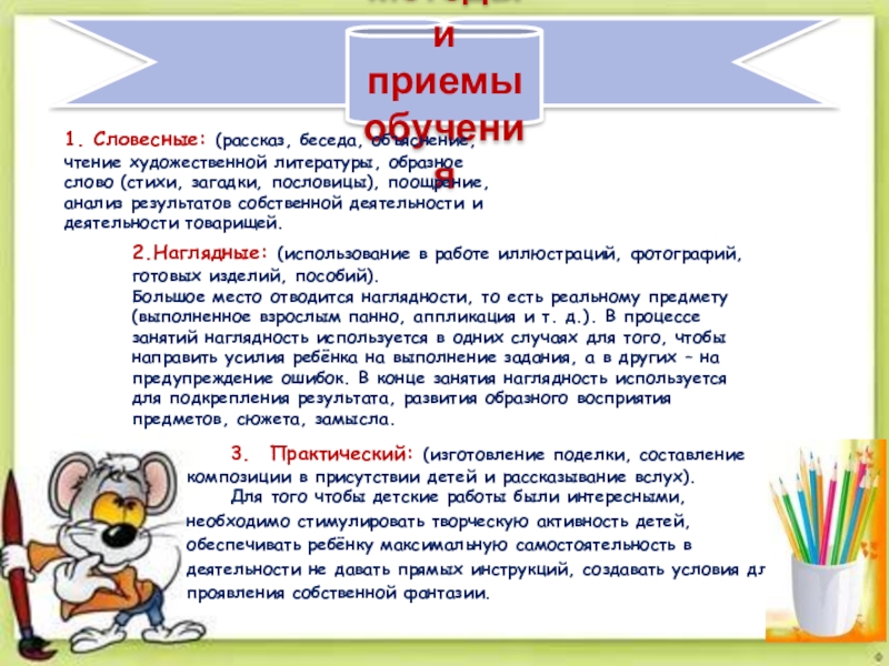 1. Словесные: (рассказ, беседа, объяснение, чтение художественной литературы, образное слово (стихи, загадки, пословицы), поощрение, анализ результатов собственной деятельности и деятельности товарищей.