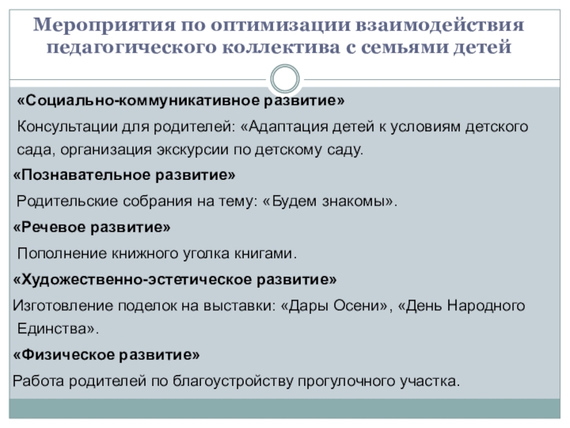 Слайд 12Мероприятия по оптимизации взаимодействия педагогического коллектива с семьями детей