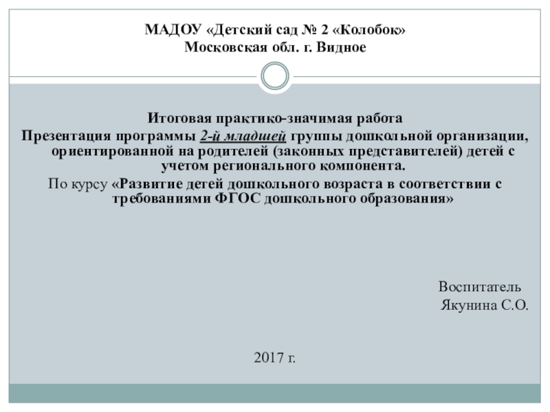 Презентация программы 2-й младшей группы дошкольной организации, ориентированной на родителей (законных представителей) детей с учетом регионального компонента.