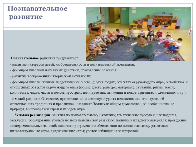 Условия реализации: занятия по познавательному развитию; тематические прогулки, наблюдения, экскурсии; оборудование уголков по познавательному развитию; наличие наглядного материала; проведение экспериментальных занятий; наличие программного обеспечения по познавательному развитию; интеллектуальные игры, дидактические игры; уголок наблюдения за природой.