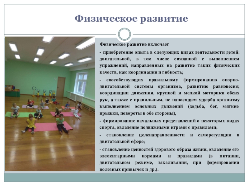 детей: двигательной, в том числе связанной с выполнением упражнений, направленных на развитие таких физических качеств, как координация и гибкость;
