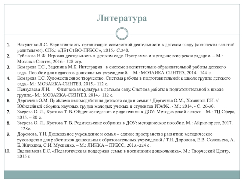 Доронова, Т.Н. Дошкольное учреждение и семья – единое пространство развития: методическое руководство для работников дошкольных образовательных учреждений / Т.Н. Доронова, Е.В. Соловьева, А.Е. Жичкина, С.И. Мусиенко. – М.: ЛИНКА – ПРЕСС, 2013.-224 с.