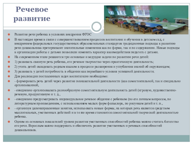 связи с совершенствованием процессов воспитания и обучения в детском сад, с внедрением федеральных государственных образовательных стандартов традиционные подходы к развитию речи дошкольника претерпевают значительные изменения как по форме, так и по содержанию. Новые подходы к организации работы с детьми позволили изменить характер взаимодействия педагога с детьми.