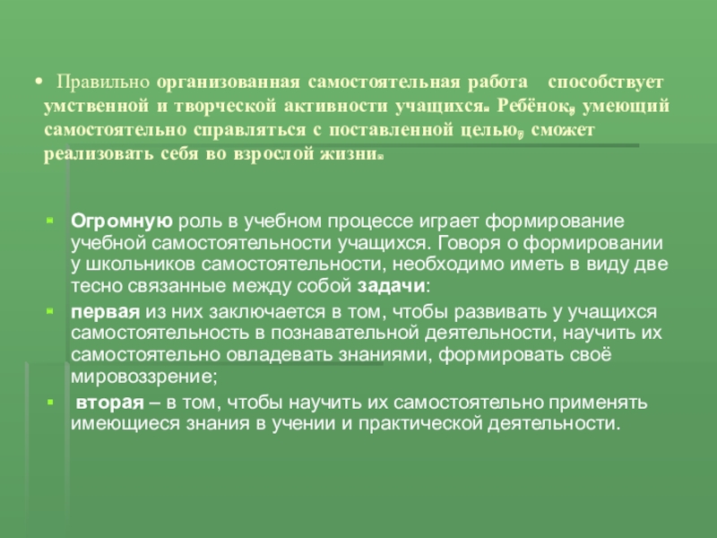 Огромную роль в учебном процессе играет формирование учебной самостоятельности учащихся. Говоря о формировании у школьников самостоятельности, необходимо иметь в виду две тесно связанные между собой задачи: