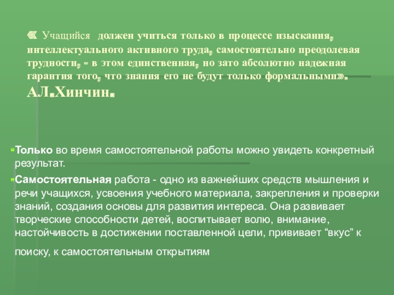 Самостоятельная работа не самоцель. Она является средством борьбы за глубокие и прочные знания учащихся, средством формирования у них активности и самостоятельности как черт личности, развития их умственных способностей.
