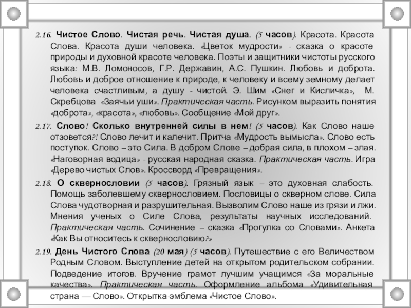2.16. Чистое Слово. Чистая речь. Чистая душа. (5 часов). Красота. Красота