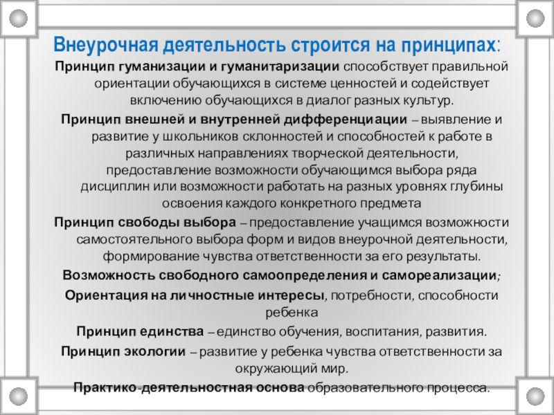 Принцип свободы выбора – предоставление учащимся возможности самостоятельного выбора форм и видов внеурочной деятельности, формирование чувства ответственности за его результаты.