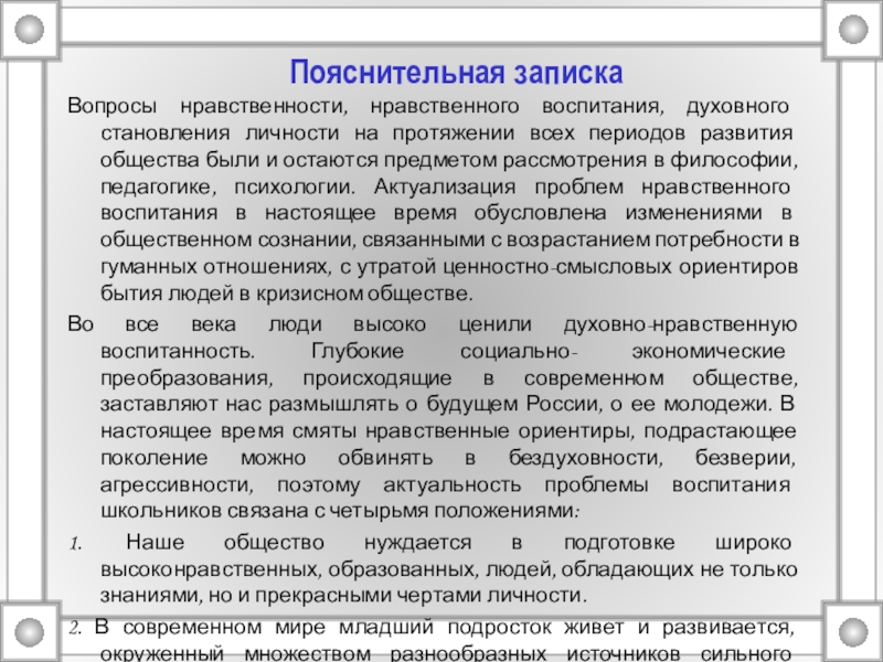 Во все века люди высоко ценили духовно-нравственную воспитанность. Глубокие социально- экономические преобразования, происходящие в современном обществе, заставляют нас размышлять о будущем России, о ее молодежи. В настоящее время смяты нравственные ориентиры, подрастающее поколение можно обвинять в бездуховности, безверии, агрессивности, поэтому актуальность проблемы воспитания школьников связана с четырьмя положениями: