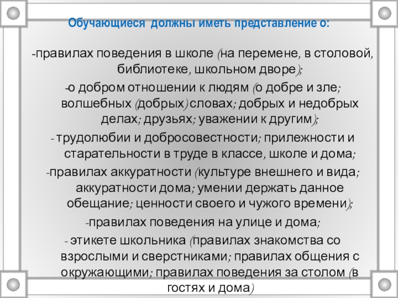 - этикете школьника (правилах знакомства со взрослыми и сверстниками; правилах общения с окружающими; правилах поведения за столом (в гостях и дома)