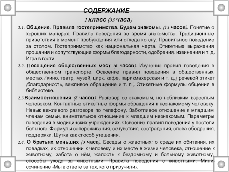 2.1. Общение. Правила гостеприимства. Будем знакомы. (13 часов). Понятие о хороших манерах. Правила поведения во время знакомства. Традиционные приветствия в момент пробуждения или отхода ко сну. Правильное поведение за столом. Гостеприимство как национальная черта. Этикетные выражения прощания и сопутствующие формы благодарности, одобрения, извинения и т. д. Игра в гости.