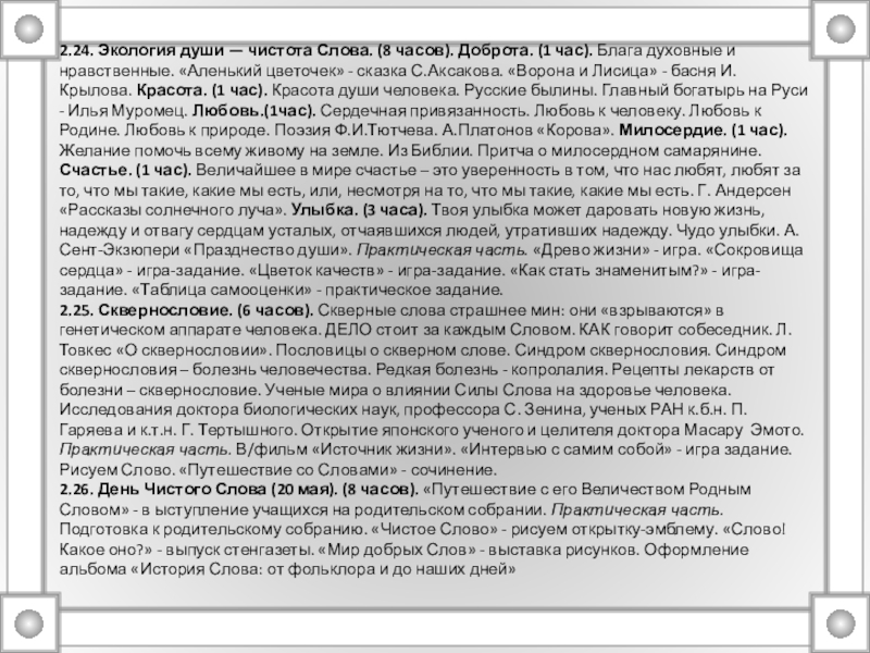 Слайд 272.24. Экология души — чистота Слова. (8 часов). Доброта. (1 час).