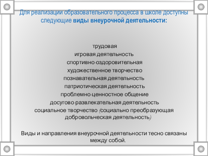 Слайд 5Для реализации образовательного процесса в школе доступны следующие виды внеурочной деятельности: