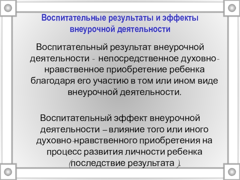 Воспитательный эффект внеурочной деятельности – влияние того или иного духовно-нравственного приобретения на процесс развития личности ребенка (последствие результата ).