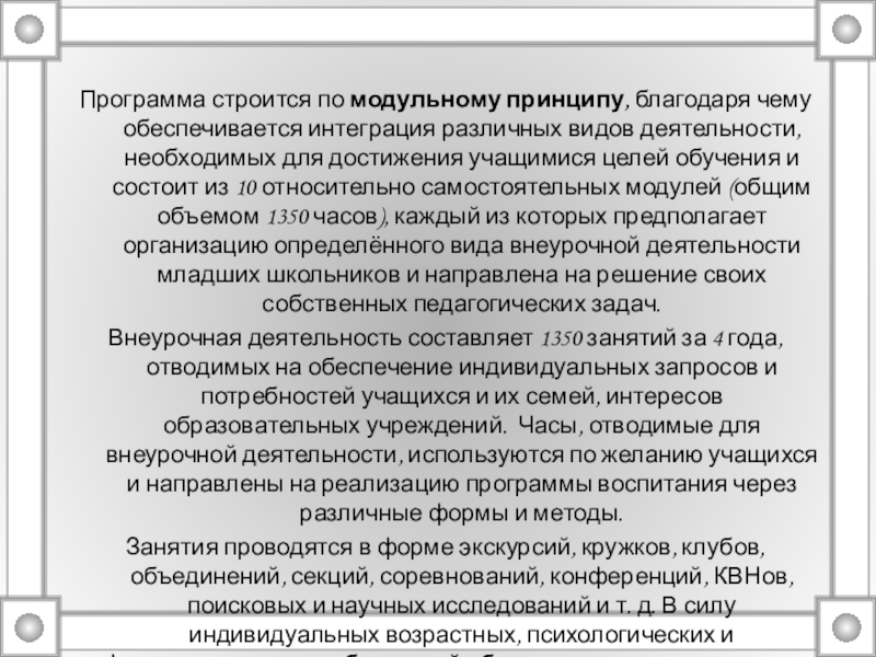 деятельности, необходимых для достижения учащимися целей обучения и состоит из 10 относительно самостоятельных модулей (общим объемом 1350 часов), каждый из которых предполагает организацию определённого вида внеурочной деятельности младших школьников и направлена на решение своих собственных педагогических задач.