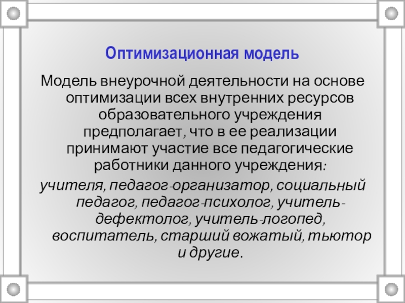 Модель внеурочной деятельности на основе оптимизации всех внутренних ресурсов образовательного