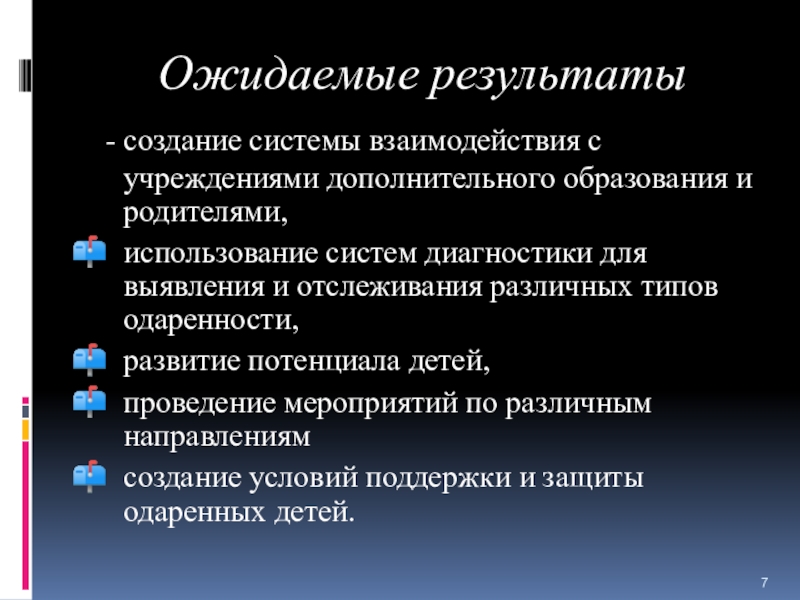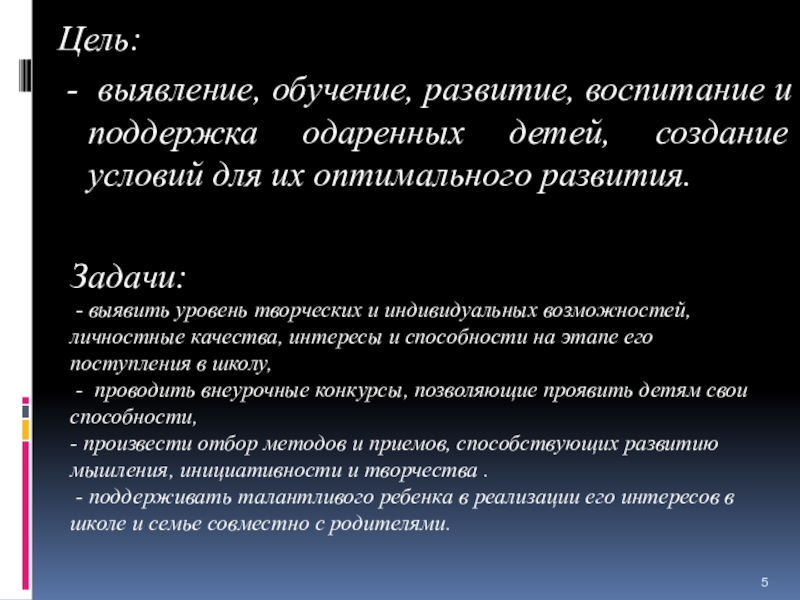 - поддерживать талантливого ребенка в реализации его интересов в школе и семье совместно с родителями.