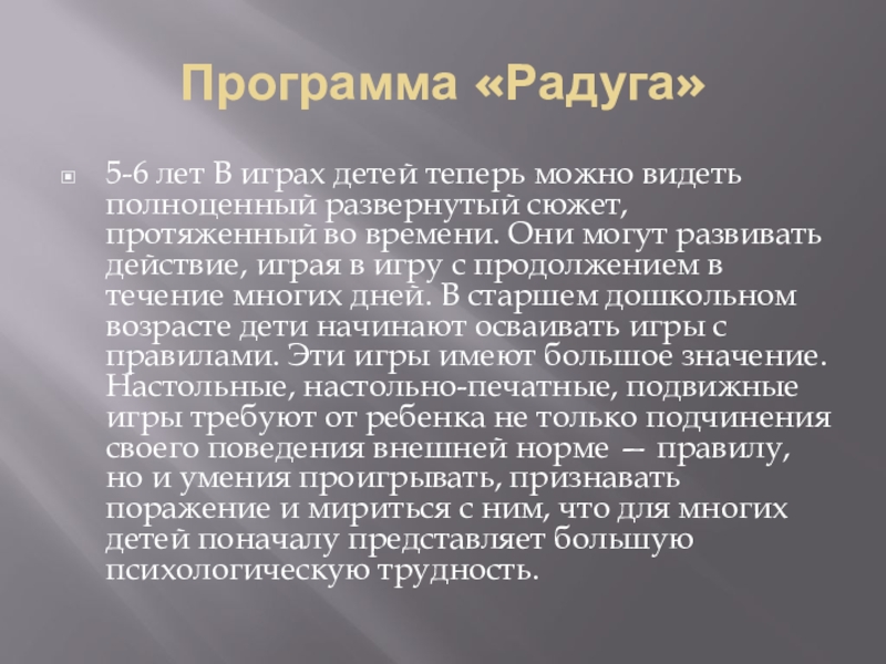 сюжет, протяженный во времени. Они могут развивать действие, играя в игру с продолжением в течение многих дней. В старшем дошкольном возрасте дети начинают осваивать игры с правилами. Эти игры имеют большое значение. Настольные, настольно-печатные, подвижные игры требуют от ребенка не только подчинения своего поведения внешней норме — правилу, но и умения проигрывать, признавать поражение и мириться с ним, что для многих детей поначалу представляет большую психологическую трудность.