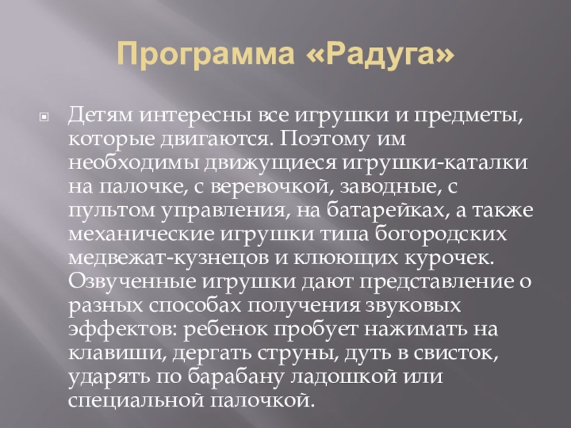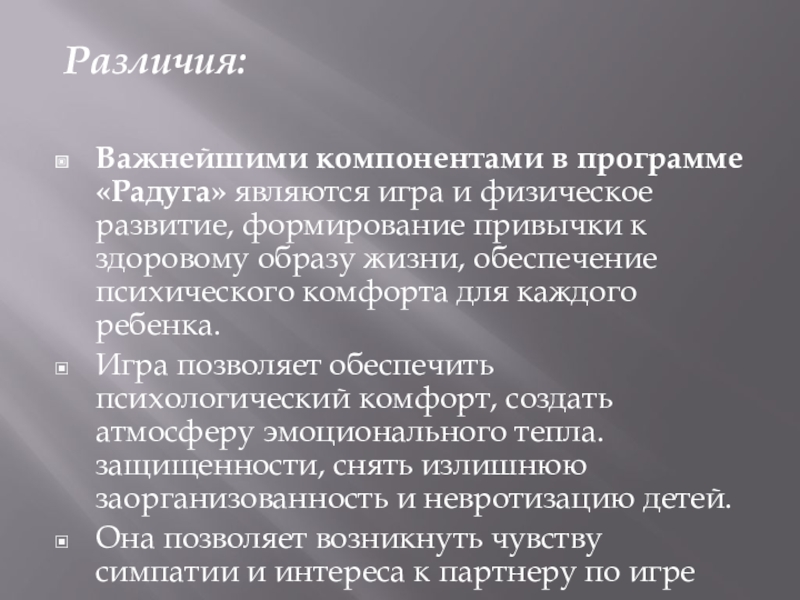 Слайд 21Важнейшими компонентами в программе «Радуга» являются игра и физическое развитие, формирование