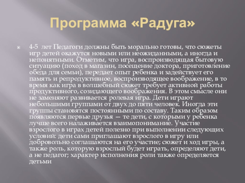 детей окажутся новыми или неожиданными, а иногда и непонятными. Отметим, что игра, воспроизводящая бытовую ситуацию (поход в магазин, посещение доктора, приготовление обеда для семьи), передает опыт ребенка и задействует его память и репродуктивное, воспроизводящее воображение, в то время как игра в волшебный сюжет требует активной работы продуктивного, созидающего воображения. В этом смысле они не заменяют развивается ролевая игра. Дети играют небольшими группами от двух до пяти человек. Иногда эти группы становятся постоянными по составу. Таким образом появляются первые друзья — те дети, с которыми у ребенка лучше всего налаживается взаимопонимание. Участие взрослого в играх детей полезно при выполнении следующих условий: дети сами приглашают взрослого в игру или добровольно соглашаются на его участие; сюжет и ход игры, а также роль, которую взрослый будет играть, определяют дети, а не педагог; характер исполнения роли также определяется детьми