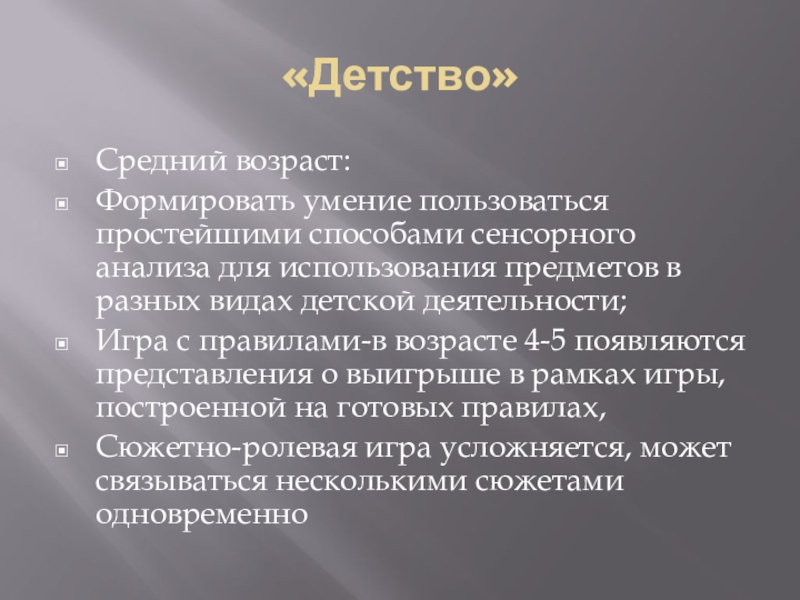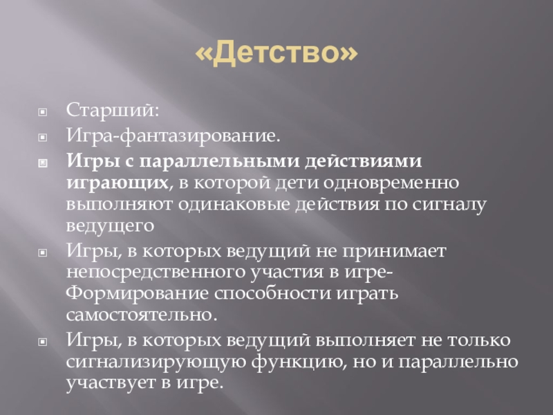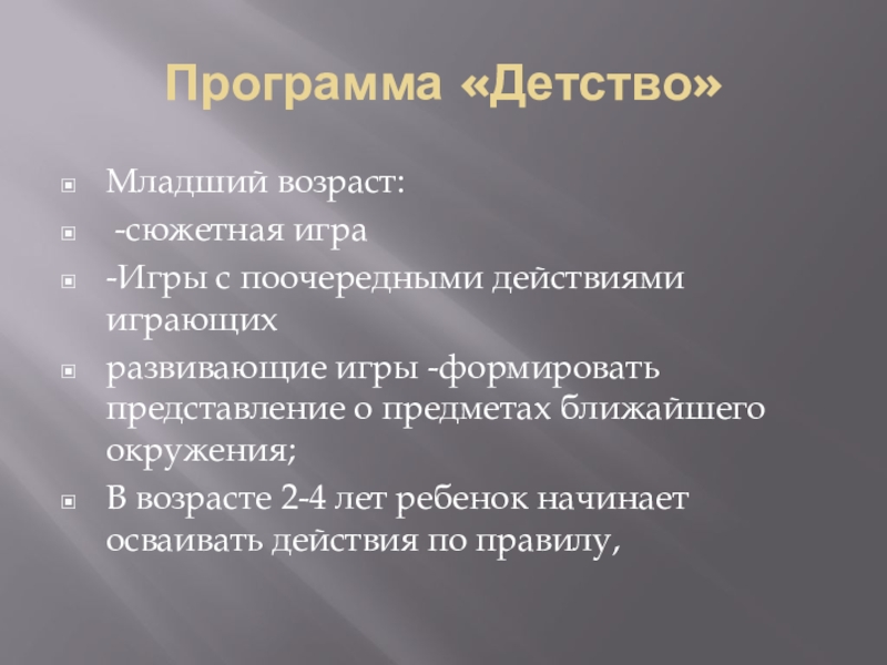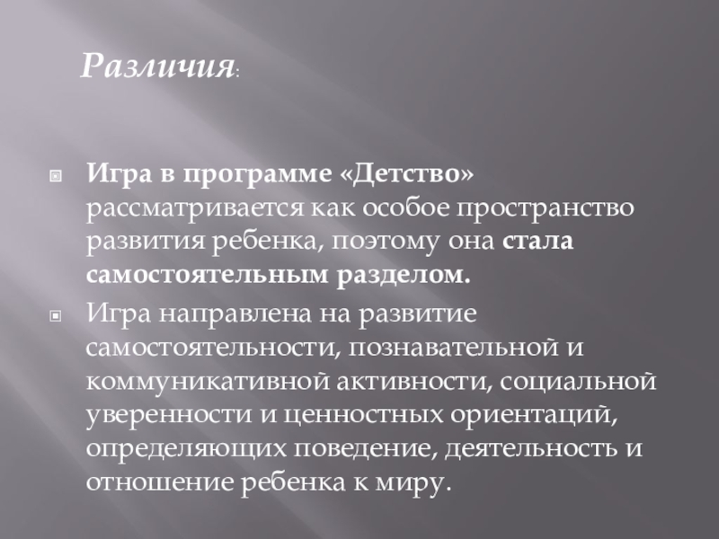 Слайд 22Игра в программе «Детство» рассматривается как особое пространство развития ребенка, поэтому