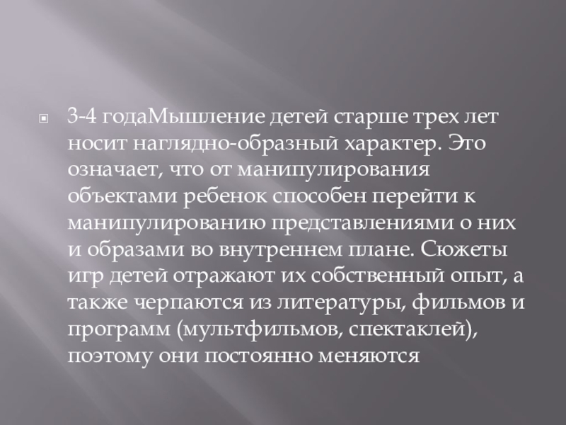 что от манипулирования объектами ребенок способен перейти к манипулированию представлениями о них и образами во внутреннем плане. Сюжеты игр детей отражают их собственный опыт, а также черпаются из литературы, фильмов и программ (мультфильмов, спектаклей), поэтому они постоянно меняются