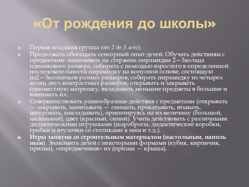 Игры занятия со строительным материалом (настольным, наполь ным). Знакомить детей с некоторыми формами (кубик, кирпичик, призма), «опредмечивая» их (призма — крыша).