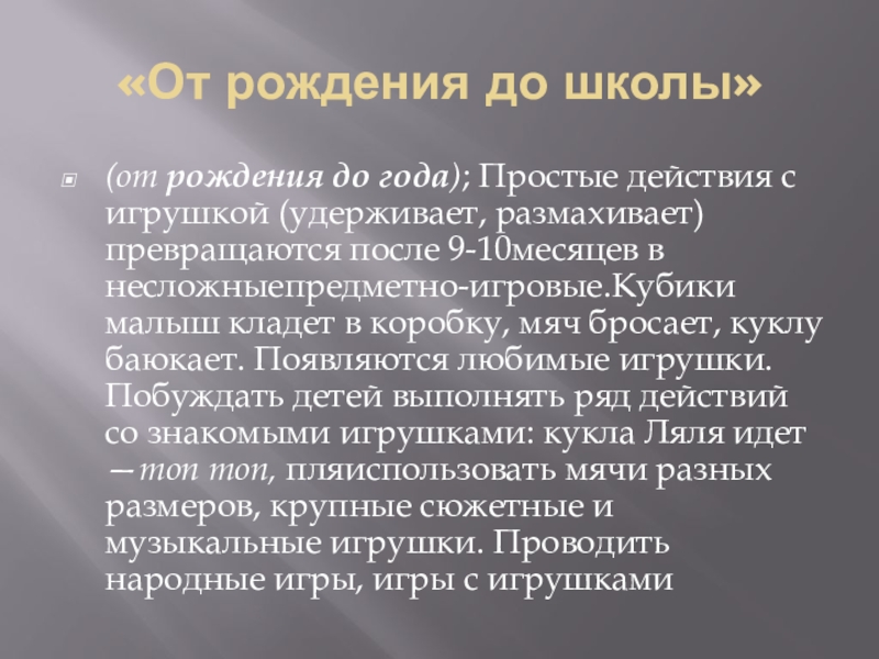 (от рождения до года); Простые действия с игрушкой (удерживает,