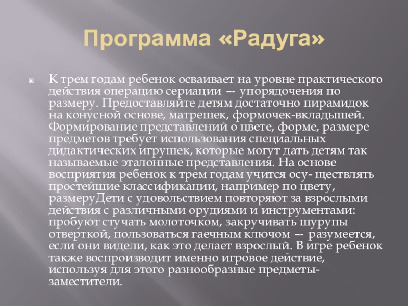 сериации — упорядочения по размеру. Предоставляйте детям достаточно пирамидок на конусной основе, матрешек, формочек-вкладышей. Формирование представлений о цвете, форме, размере предметов требует использования специальных дидактических игрушек, которые могут дать детям так называемые эталонные представления. На основе восприятия ребенок к трем годам учится осу- ществлять простейшие классификации, например по цвету, размеруДети с удовольствием повторяют за взрослыми действия с различными орудиями и инструментами: пробуют стучать молоточком, закручивать шурупы отверткой, пользоваться гаечным ключом — разумеется, если они видели, как это делает взрослый. В игре ребенок также воспроизводит именно игровое действие, используя для этого разнообразные предметы-заместители.