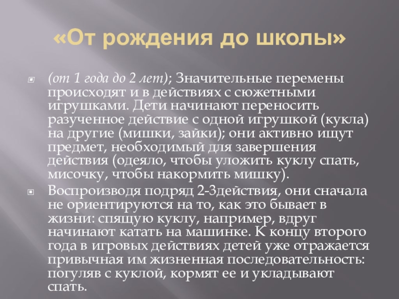 Воспроизводя подряд 2-3действия, они сначала не ориентируются на то, как это бывает в жизни: спящую куклу, например, вдруг начинают катать на машинке. К концу второго года в игровых действиях детей уже отражается привычная им жизненная последовательность: погуляв с куклой, кормят ее и укладывают спать.