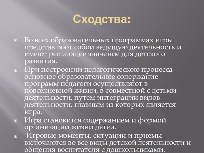 Во всех образовательных программах игры представляют собой ведущую деятельность и имеют