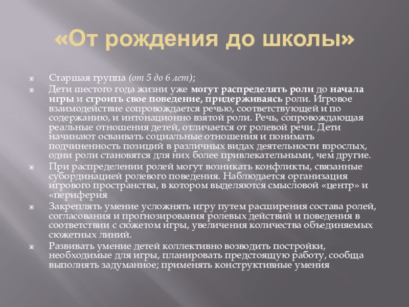 года жизни уже могут распределять роли до начала игры и строить свое поведение, придерживаясь роли. Игровое взаимодействие сопровождается речью, соответствующей и по содержанию, и интонационно взятой роли. Речь, сопровождающая реальные отношения детей, отличается от ролевой речи. Дети начинают осваивать социальные отношения и понимать подчиненность позиций в различных видах деятельности взрослых, одни роли становятся для них более привлекательными, чем другие.