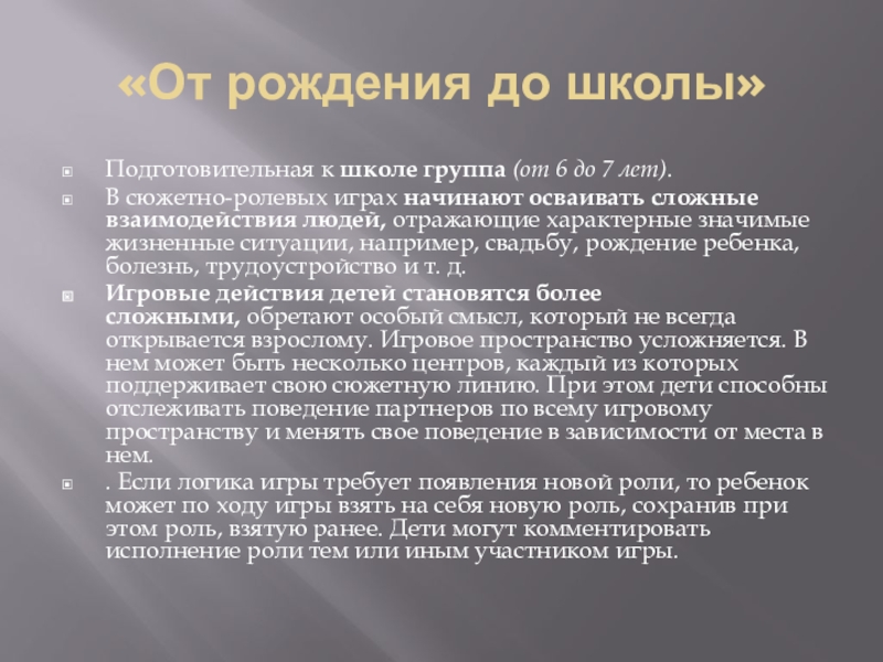 играх начинают осваивать сложные взаимодействия людей, отражающие характерные значимые жизненные ситуации, например, свадьбу, рождение ребенка, болезнь, трудоустройство и т. д.