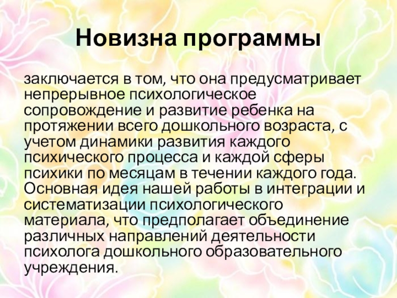 и развитие ребенка на протяжении всего дошкольного возраста, с учетом динамики развития каждого психического процесса и каждой сферы психики по месяцам в течении каждого года. Основная идея нашей работы в интеграции и систематизации психологического материала, что предполагает объединение различных направлений деятельности психолога дошкольного образовательного учреждения.