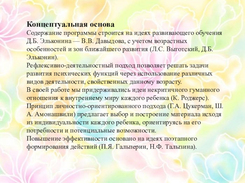 Содержание программы строится на идеях развивающего обучения Д.Б. Эльконина —