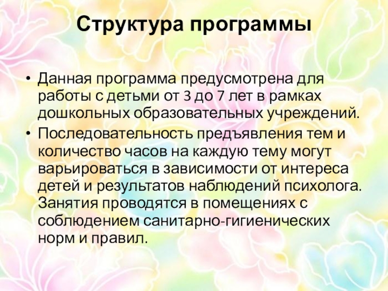 Последовательность предъявления тем и количество часов на каждую тему могут варьироваться в зависимости от интереса детей и результатов наблюдений психолога. Занятия проводятся в помещениях с соблюдением санитарно-гигиенических норм и правил.