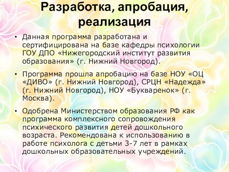 Одобрена Министерством образования РФ как программа комплексного сопровождения психического развития детей дошкольного возраста. Рекомендована к использованию в работе психолога с детьми 3-7 лет в рамках дошкольных образовательных учреждений.
